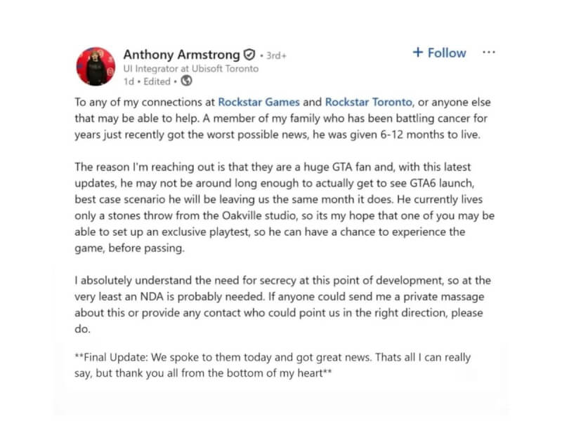Ubisoft Toronto හි developer කෙනෙකු වන Anthony Armstrong, තම පවුලේ සාමාජිකයෙකු වෙනුවෙන් මෙම ඉල්ලීම පසුගිය මාසයේදී කළ අතර, gaming industry එකෙහි සම්බන්ධීකරණ හෝ හිතවත් අයගෙන් උපකාරයක් ලබා ගැනීමට උත්සාහ කළාය. ඔහුගේ පණිවිඩයේ සඳහන් වුනේ, "මගේ පවුලේ සාමාජිකයෙකුට පිළිකා රෝගය වසර ගණනාවක් පුරා පීඩා ගෙනදෙමින් සිටින අතර, ඔහුට ඉතා නරක පුවතක් දැනුම් දී ඇත. ඔහුට ඉතිරිව තිබෙන කාලය මාස 6-12 අතර බවයි. ඔහුට GTA ක්රීඩාවට දැඩි ආසාවක් ඇති අතර, GTA 6 නිකුත් වීමට පෙර එය අත්විඳීමට අවස්ථාවක් ලැබිය යුතුයි බවයි".